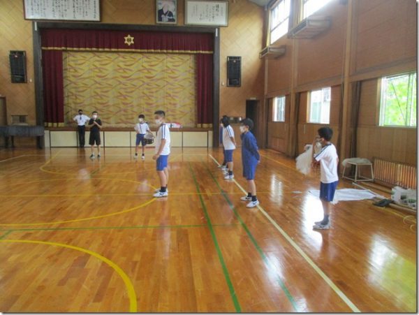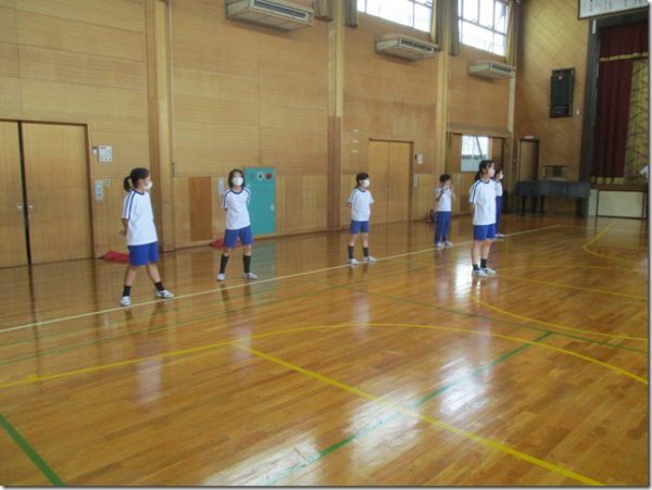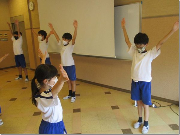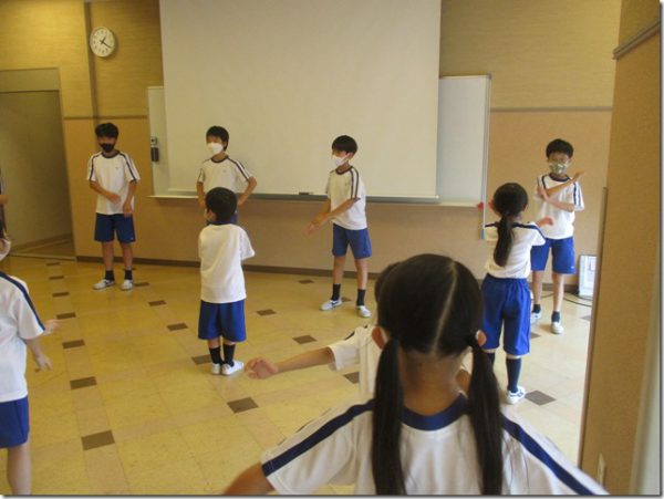 「和」の部屋では、準備体操係が活動中。今日は低学年に声かけをして、ラジオ体操の練習を行っていました。
