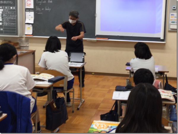 Even the homeroom teacher came to the front of the class and joined the game. Can you guess what action he is doing?