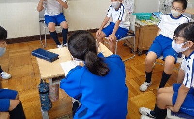 2時間目の体育の学習は、来週の球技大会に向けてキックベースの練習を行いました。作戦会議を行ったあと、チームで練習します。キックの練習をする人や、キャッチの練習をする人など、それぞれの弱点を補うために、工夫した練習をしています。その練習が試合でもたくさん発揮されていました。