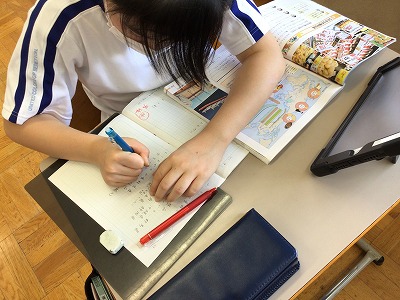 外国産の食料品が多く並べられている事に気づきます。どうして、このように輸入品が多いのか?について、自分の考えをノートに書いています。