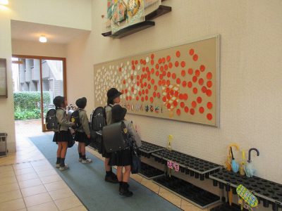 玄関の掲示は、玉入れの雰囲気を作っています。