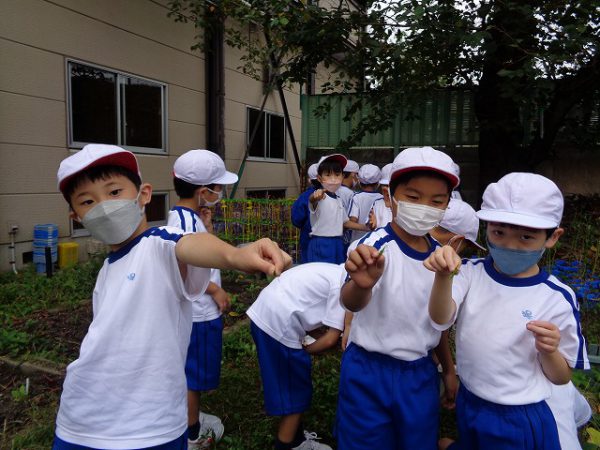 学習園には、あちこちにバッタがいました。捕まえて記念写真です。