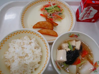 今日の献立は「五目豆腐、はるさめサラダ、ポテト」でした。