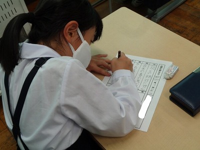 このテストは、担任が話した文章を一回で聞き取り、プリントに書く活動です。