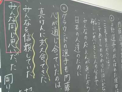 月かげの授業は、「十六番目の選手」というお話を読みました。日本代表女子ソフトボールチームが、北京オリンピックで金メダルを獲得した時、ケガで代表選手を外れてしまった内藤選手のお話でした。同じグラウンドで戦っていなくとも、同じチームの一員として心を一つにできたのはどうしてだったのだろうということを、みんなで話し合い、「良いチーム」とはどんなチームなのかについてを考えました。この授業で学んだことを生かして、球技大会でもそれぞれが活躍してほしいと思います。