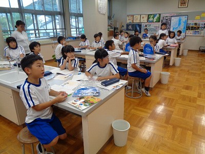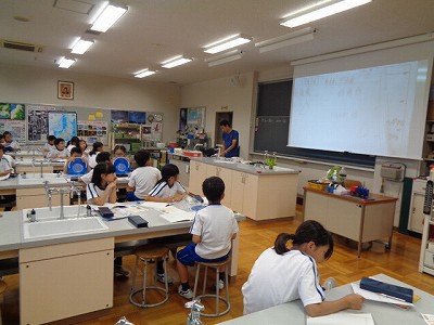 理科授業では、月の動きを調べてくるという宿題をもとに、月の動きを学習しました。夕方以降にしか本物を確認できないので、しっかり宿題をしたかどうか、が大切です。残念ながら忘れてしまった児童には、月の見える晩にチャレンジしてもらいます。