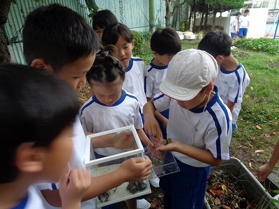 休み時間は、教室で飼いはじめたザリガニの水そうに石や木の枝を入れて、隠れられるようにしてあげるなど、生き物への関心が高い人がたくさん。