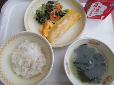 わかめ、玉ねぎ、コーン、ねぎを合わせたスープです。わかめのヌルヌルしたものは、アルギン酸という成分で食物繊維のひとつです。ほかにも、髪の毛や皮膚の健康を保つヨウ素をふくみ、ミネラル豊富で栄養のある食べものです。