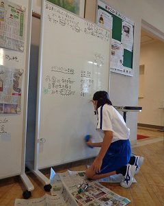 In front of the school’s office and 2nd floor gallery, there are white boards displaying pages from the Asa-sho newspaper for elementary school students. Children of Event, Game committee have written comments and summaries on the board.