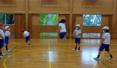 今日の朝根っこタイムはマラソンの予定でしたが、台風の影響で大雨のお天気となり、体育館をつかって大縄とびを行いました。