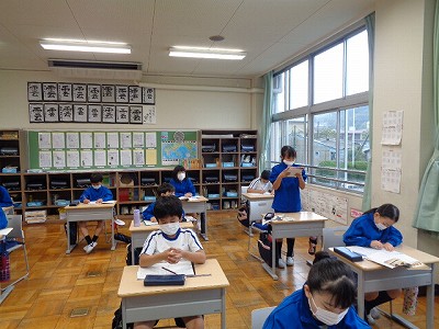 社会は、用水の建設についての学習です。今日は、工事の様子について、調べ学習発表の後半戦を行いました。友達の発表に、「へぇ~!」という声がたくさん上がっていました。ノートにメモをとりながら、いろいろな側面から疏水工事への理解を深めることができました。