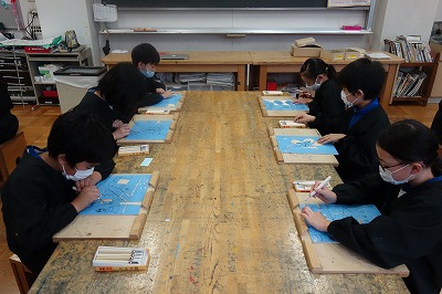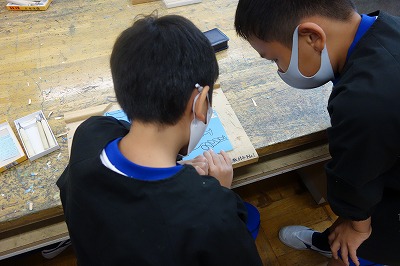 途中の休憩時間や、後片付けに入った直後などは、友達と意見交流をしたり「ここも彫らんと黒になっちゃうよ。」「ここ、三角刀を使ってみたんだけど、どう?」など、教え合いをしたりする場面が見られました。