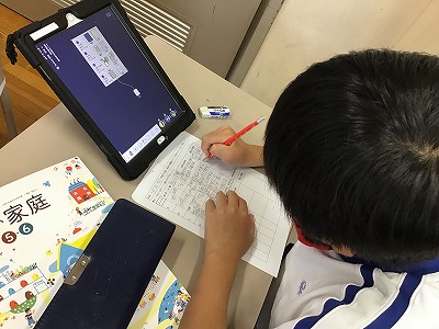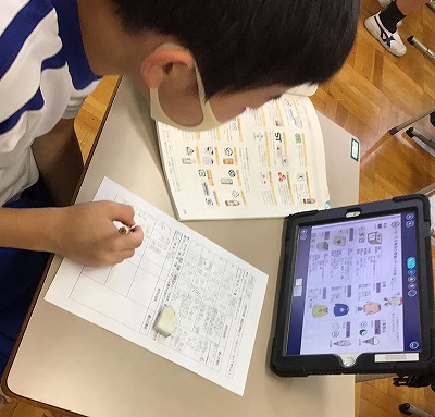 タブレットに届いたノートの「情報」をもとに、比べる表を完成します。その表をもとに、理由を持って“ノート選び”を行います。