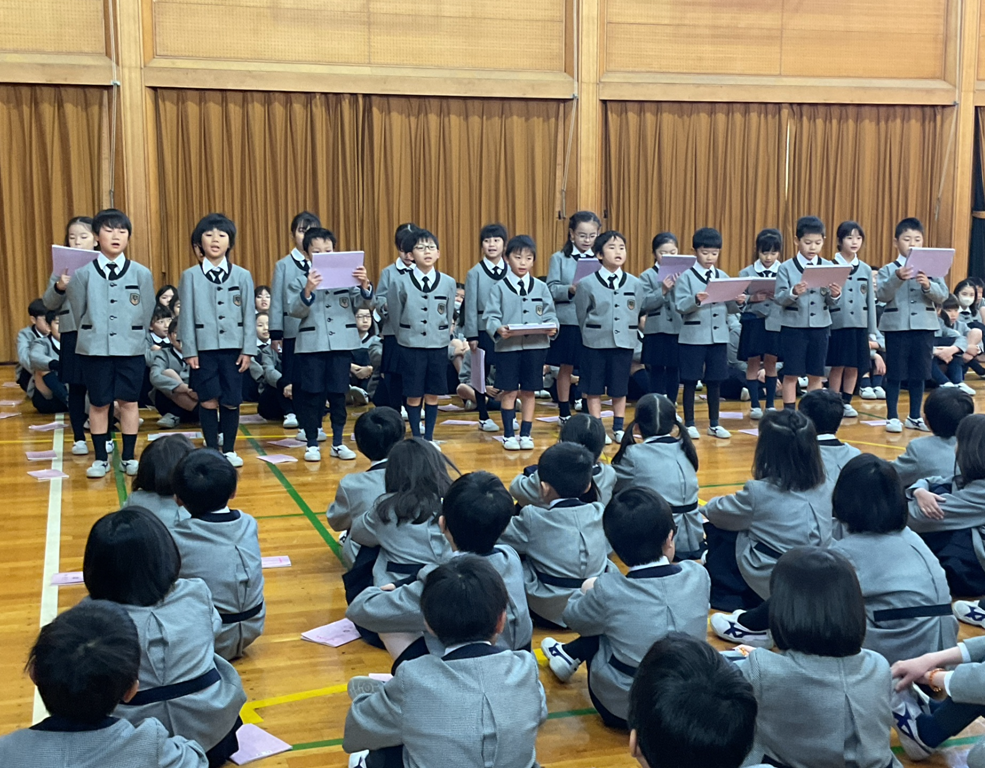 低学年の発表です。1年生は、百人一首の青色かるたを発表しました。