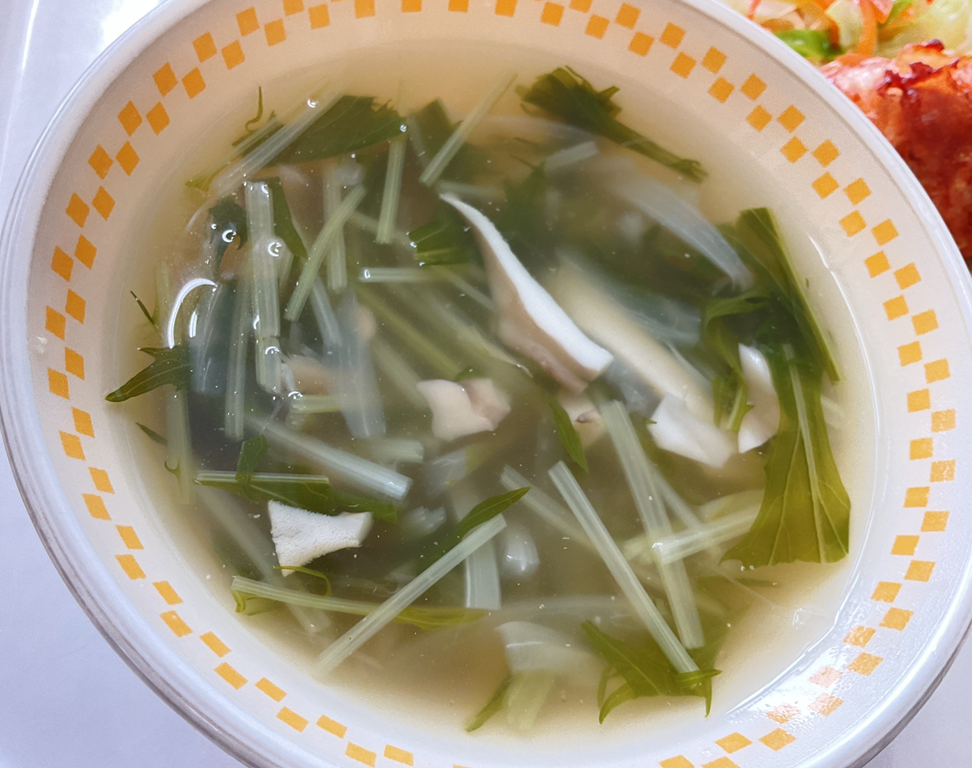 ☆ 「野菜スープ」は、旬をむかえた舞茸と水菜、玉ねぎを合わせています。舞茸の香りが豊かなスープになりました。