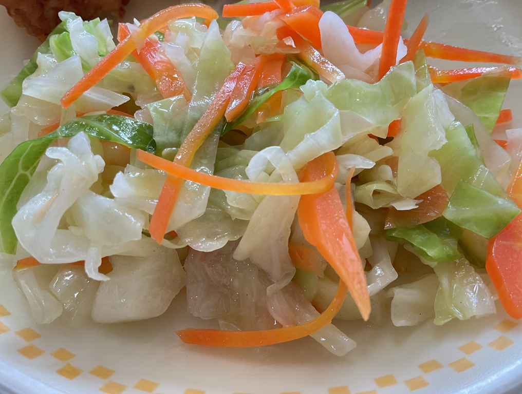 ☆ 「人参サラダ」は、いつもより長めに切った人参とキャベツを合わせています。ドレッシングは油と酢、レモン汁、塩こしょうを合わせて作りました。