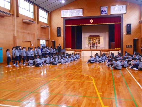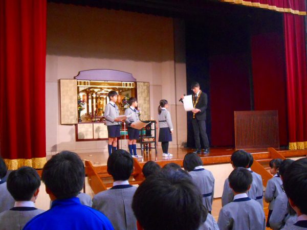 礼拝の時間に、創立120周年記念事業のテーマ「ともいき社会の実現」に向けて貢献したということで、昨年度取り組んだキクタニギクプロジェクトの取り組みを表彰していただきました。