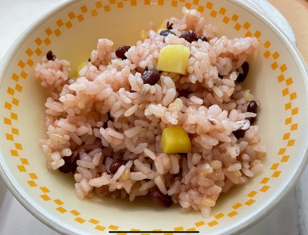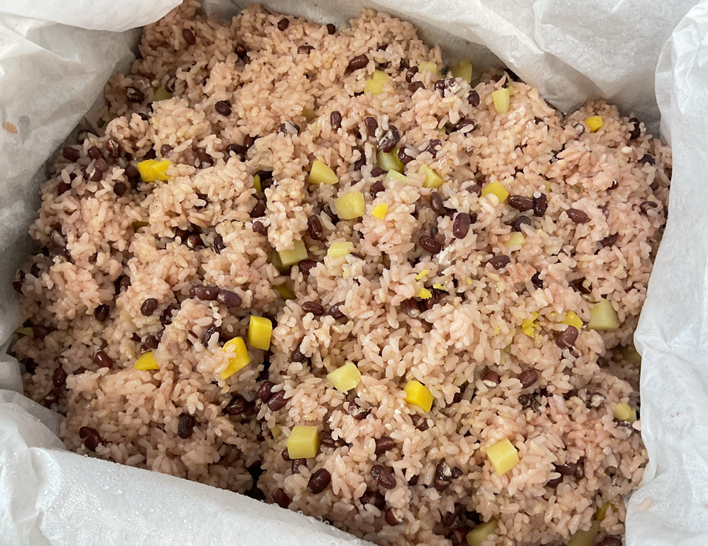 小豆だけでなく、小さくさいの目切りにした「さつまいも」も加えました。さつまいもは2年生が学校の畑で収穫してくれたさつまいもが混ざっています。感謝の気持ちと京都文教学園120周年をお祝いする気持ちを持っていただきました。