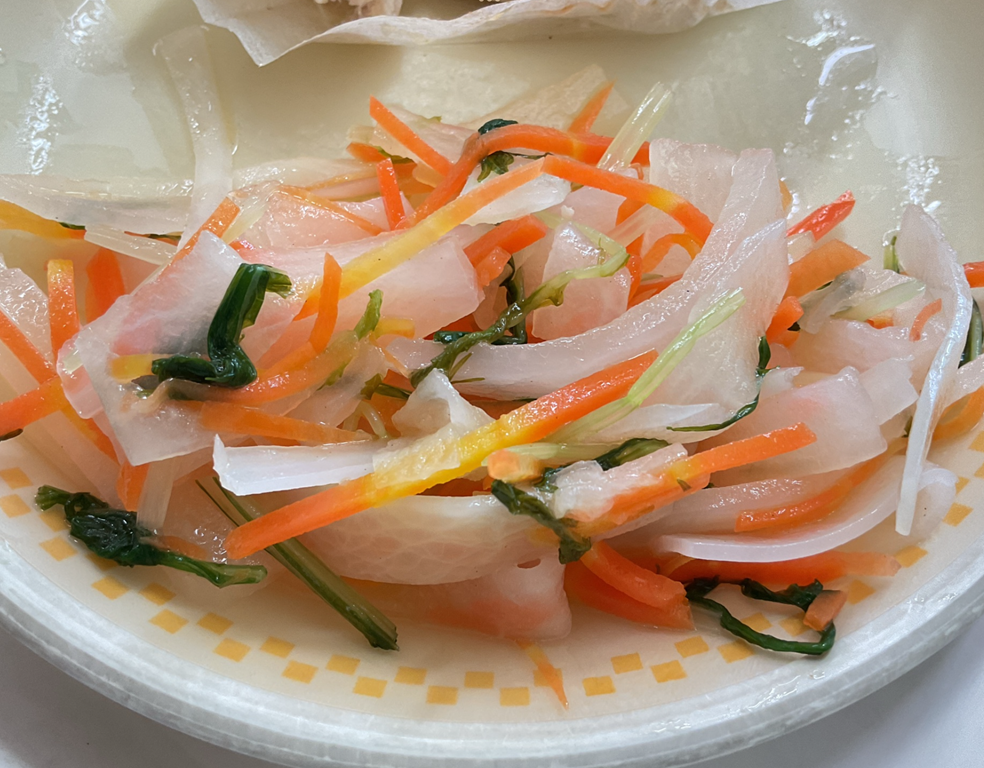 ☆ 「水菜のサラダ」は、水菜の濃い緑色がきれいなサラダになりました。シャキシャキとした食感は水菜をゆがいてもしっかり残っています。