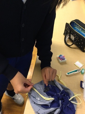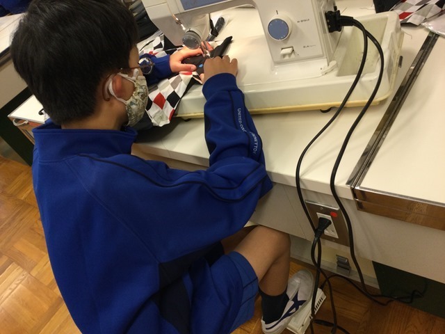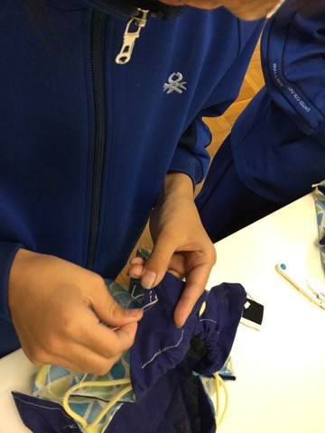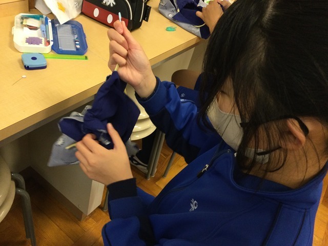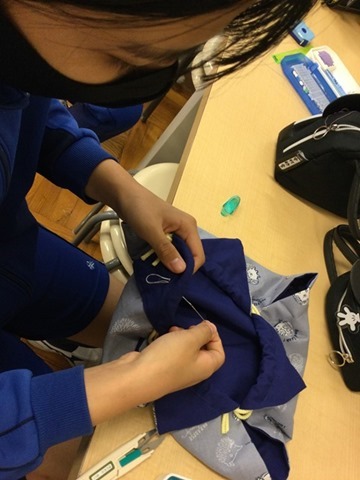セットに付いている☆のアップリケを手縫いで縫い付ける人(中には、ミシンで縫い付けた人も…)、エプロンの時に残しておいたシールアップリケをアイロンで付ける人と、多彩に取り組んでいます。