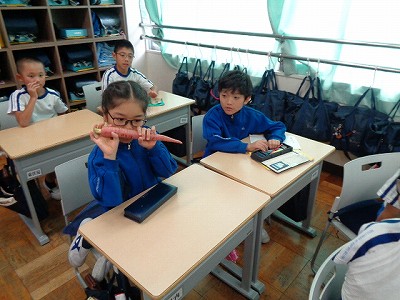 社会の時間に、京野菜学習の一つとして、金時人参を実際にさわってみました。
