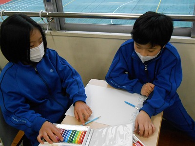 今日は早速、係活動の時間です。係のポスターを作りながら、3学期にどんな活動を行うのかを話し合って決めていきます。