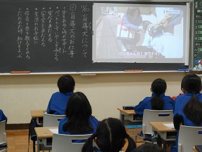 2時間目は、月かげの学習です。今日は、盲導犬についての学習を行いました。盲導犬は一体どんなお仕事をしているのでしょう?4年生の中からは、いろいろな予想が上がりました。