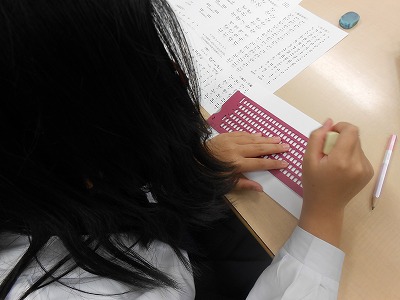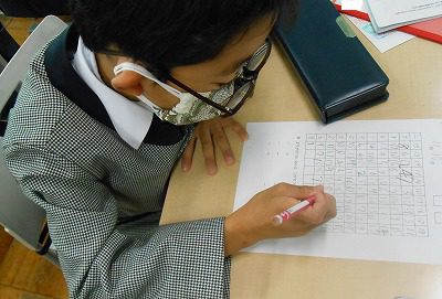 点字はまちがえてしまうと、消しゴムで消すことができません。「どうしよう!まちがえた!」という声が教室のあちこちから聞こえて来ました。最後にメッセージを交換して読んでみたのですが、正しく書けていた人は少なく、点字の難しさにも気づきました。