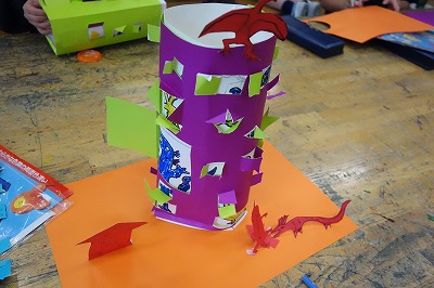 この児童の作品では、窓を開けるといろいろなかいじゅうが姿を見せるのですが、それだけでなく色厚紙を使って、周りにも違ったかいじゅうが作られています。