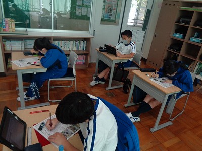 1時間目の国語の時間は、世界にほこる和紙の要約の続きに取り組み、最後にみんなで共有しました。筆者の伝えたいことを最後に必ず入れることや、簡潔に和紙の説明を行うことなど、要約のポイントをおさえながら、うまく200字にまとめることができました。