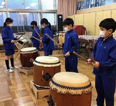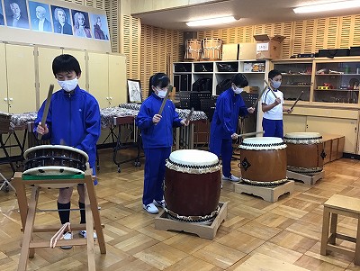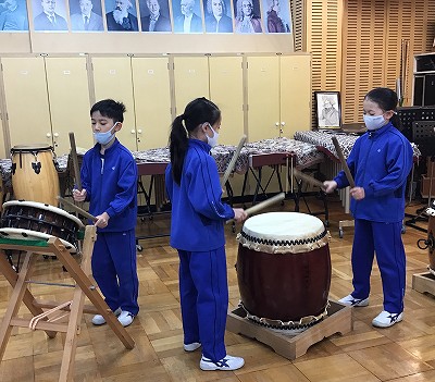 リズムパターンの組み合わせ方を工夫し、そこに自分達が考えたメロディを重ねた「おはやしづくり」の学習のまとめです。