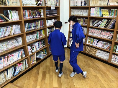 書き終わった人から、図書室に移動します。“怪談シリーズ”の棚の前で、何やら情報交換…!?