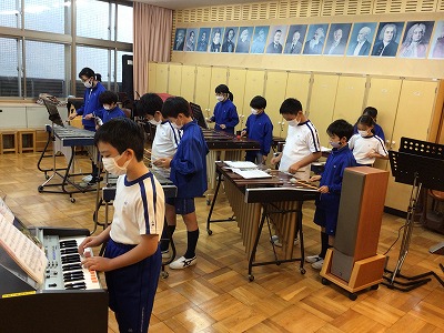 リコーダーの二重奏が美しい「♪風とケーナのロマンス」を、木琴/鉄琴/オルガン類で合奏する時間です。