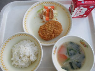 今日の献立は「牛肉コロッケ、キャベツの煮びたし、もやしのみそ汁」でした。
