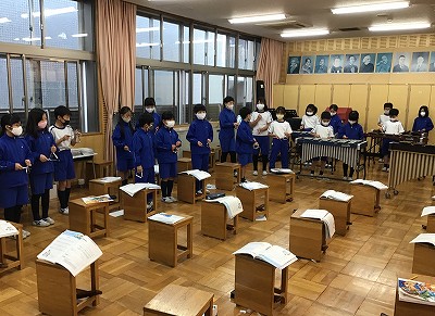 「♪雪のおどり」の歌唱に合わせて、リズム楽器や木琴鉄琴の伴奏を重ねる学習に取り組みました。