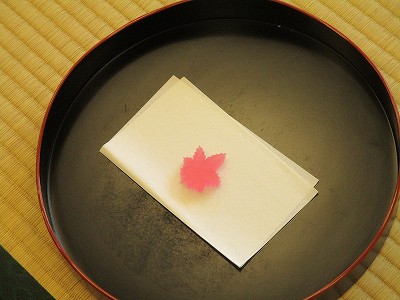 お菓子は一人ずつ先生に配っていただきました。今日のお菓子はお干菓子です。中はゼリーのようにやわらかい琥珀のお菓子です。