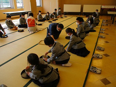今日の2,3校時は、1年ぶりの礼法の時間です。はじめに、礼法の先生に掛け軸とお花の説明をして頂きました。今日のお花は、『ツワブキ』です。