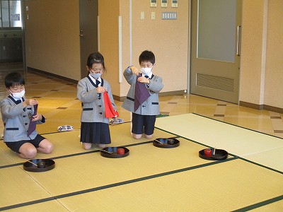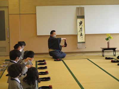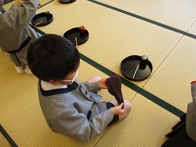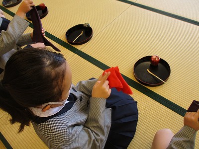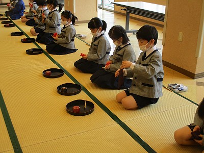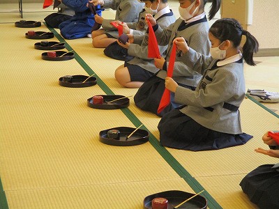 来週も、帛紗さばき、お棗、お茶杓を清めるお作法を繰り返し練習する予定です。『ハンカチで練習してきます。』と意欲を出している子ども達がいて、楽しみです。