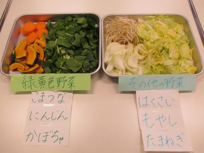 実際に野菜を使って緑黄色野菜100グラム、その他の野菜200グラムを自分達の感覚でとってもらいました。