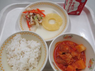 今日の献立は「ポークビーンズ、白菜のおかか和え、パイナップル」でした。