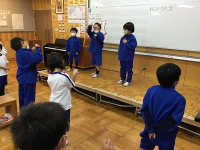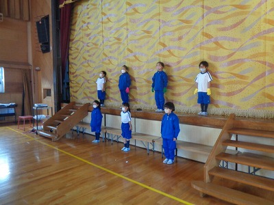 そこで、舞台の上に上がって友達の鳴き声を“まねっこ”する活動を取り入れました。