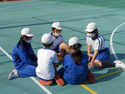 他のチームの様子を見ながら、どんな方法で攻めるのがよいのかを考えます。1試合が終われば、作戦会議です!反省を活かして、次のゲームに繋げます。