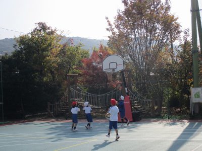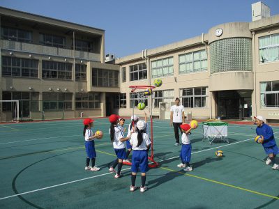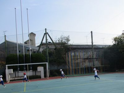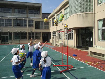 ボール運動では、ゴールを狙って高く投げる練習をしました。