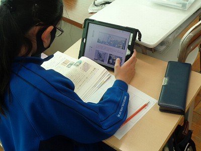 4時間目の国語は、京都の伝統産業についてのリーフレット作りを行います。リーフレットを作るにあたって、まずは調べ学習です。その伝統産業の「よさ」や「魅力」を伝えるために、どんな部分がポイントになるのかを調べていきます。
