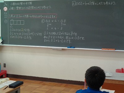 算数は、今日から新しい単元「小数のかけ算とわり算」がスタートしました。まずは、小数×整数の計算からです。「0.1」がいくつ分あるのかと考える方法や、小数を10倍や100倍して整数にしてから計算する方法の2通りで、小数×整数の問題を解いていきました。
