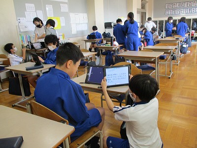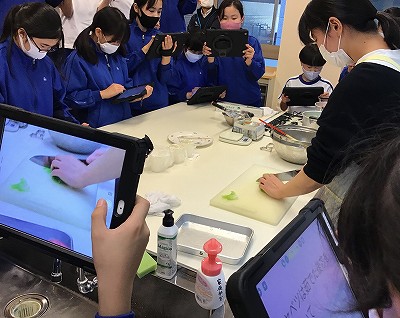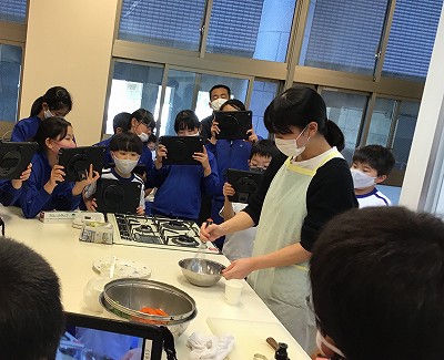 現状では、みんなで調理した物を食することはできないので、食栄養教諭の居相先生に調理をお願いし、5年生は各場面毎に、気づいたことや初めて知ったことなどを、ロイロノートに打ち(書き)込む形で“エア実習”を行いました。
