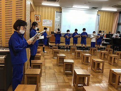 座席のグループから、ソプラノパートかアルトパートかを選び、分かれて、歌声を合わせた練習をしています。