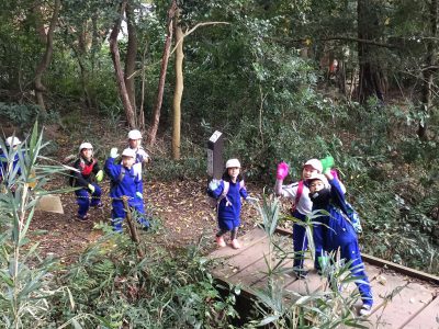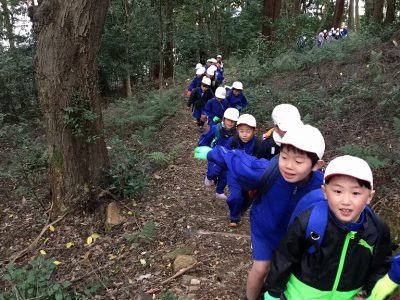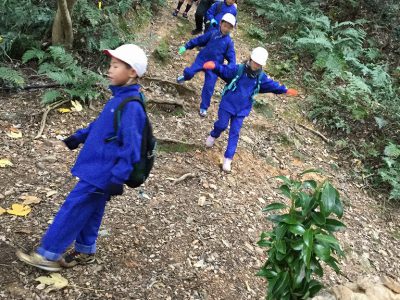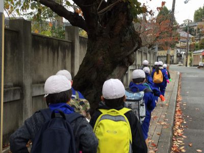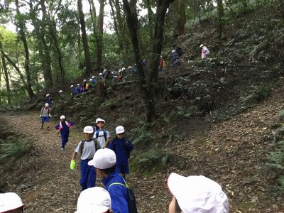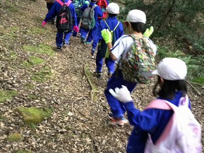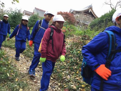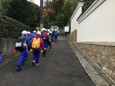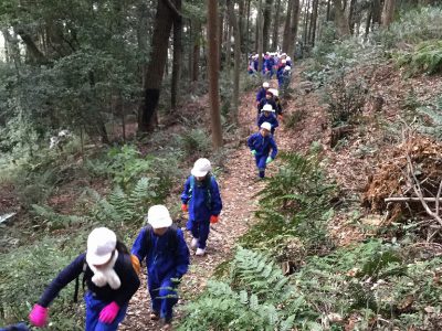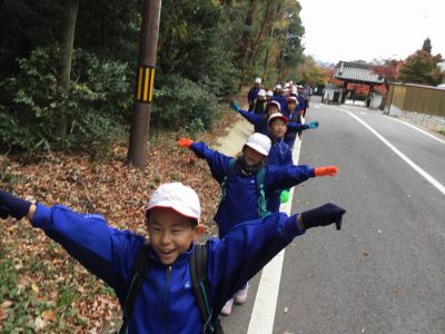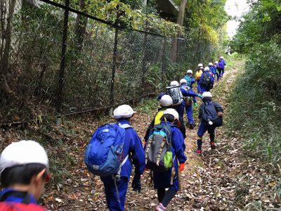 本気の山登りに向け、ネックウォーマーやパーカーも装備して学校を出発です!