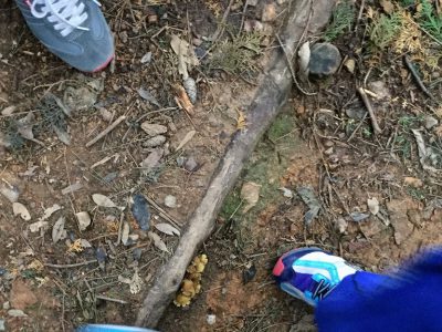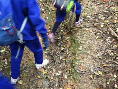 途中にキノコが生えていたり、シダの葉っぱが茂っていたり、先日の台風でできた雨の道をまたいだりして、上っていきます。