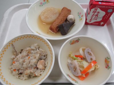 今日の献立は「きのこの炊き込みごはん、おでん、れんこんのごま和え」でした。